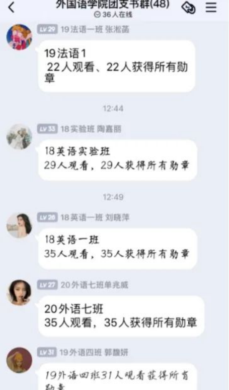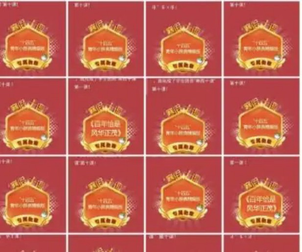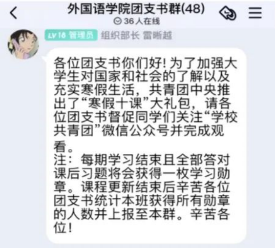 “寒假十课”系列视频主要围绕 理想、祖国、榜样、青春、未来五大篇章展开教学。完成每课的学习视频并在课后回答相关问题,会获得对应的一枚徽章。通过徽章收集和分享,激励同学们参与。在每一次课程更新后,我们会在团支书群提醒大家,并要求每位同学学习完成后在班级群及时打卡,汇报学习成果,并互相激励。