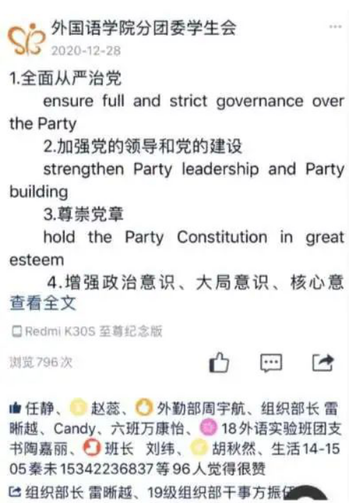 通过学习强国app等官方平台寻找查阅选取党团相关知识的英文翻译作为学习内容,利用团委宣传栏QQ平台,每周发布两次学习内容,要求同学们关注学习,并准备于开学后5月就发布的学习内容组织竞赛,选取优秀学习标兵进行表彰。