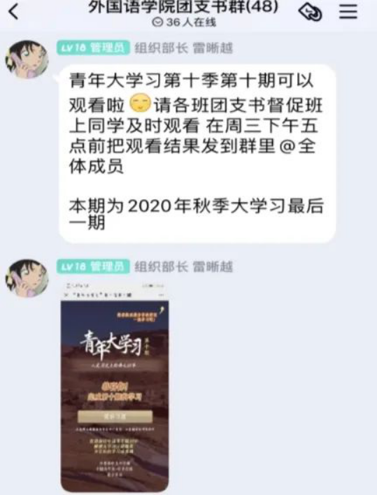 要求团员放假不放松学习,坚持打卡青年大学习,完成放假后的第十季最后两期。