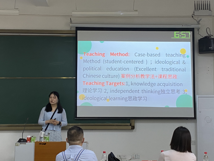 宋梨园老师带来的课程内容是《国际商务谈判》,节选自该教材的第一单元,国际商务谈判导论。教学展示中,宋老师主要采取了案例分析教学法并融合以课程思政。课程里,宋老师利用两个厨师分一个苹果派的案例向学生介绍商务谈判这一概念。并且由具体的案例分析环节向学生介绍两项基本的谈判原则:平等原则、共赢原则。最后由本课程切入思政。让学生们从这两项基本的谈判原则总结出一些优秀的中华传统文化思想:尊重平等、共建共赢。以此来培养学生们对于优秀传统文化的传承意识,以及增强她们对于本民族文化的文化自信。