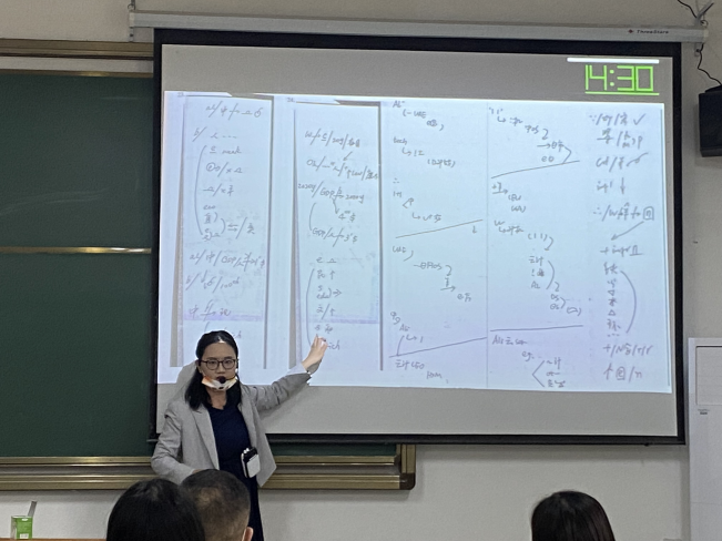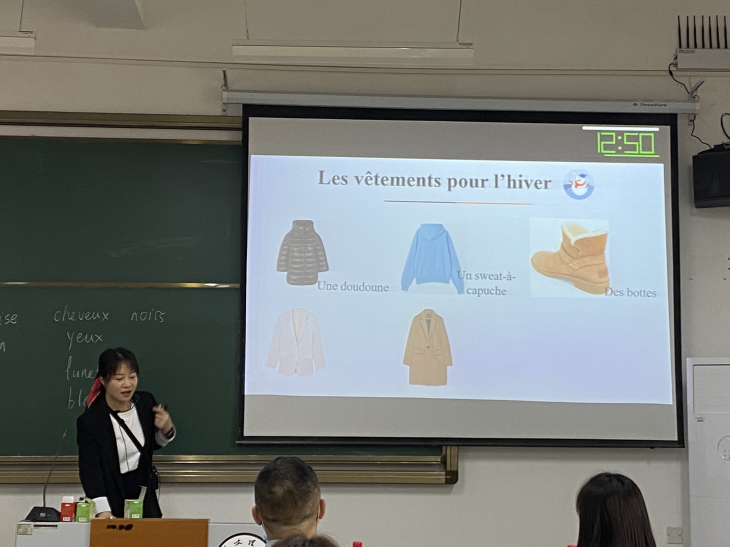 陈思然老师展示的是综合法语II第九课 Vive les soldes!我为血拼狂。根据情景教学法,首先介绍一位同学的穿搭让同学们猜是谁来引入服饰类词汇的学习,紧接着通过不同季节saison学习主题词汇,之后变换不同场景让学生选择穿搭来运用刚刚所学的主题词汇,最后根据跨文化交际理论,在了解法式穿搭tenue française 后对比中国人传统服饰,作业就是小组为单位口头描述一套中国传统服饰(中国传统服饰 costume traditionnel chinois )。