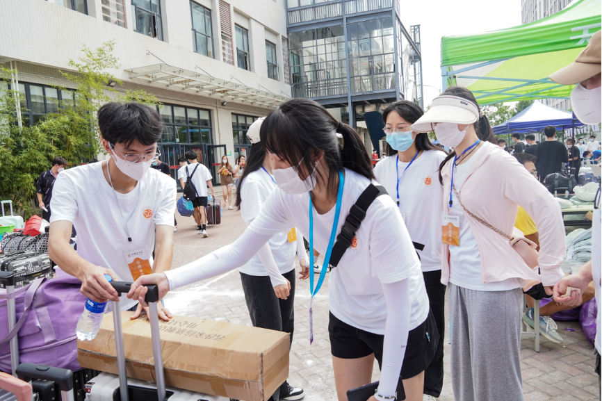 在完成校外资料核查后,学长学姐们其中一人引导新生报到,其余人便帮助新同学将行李运送至校内食堂站寄存点。温暖的阳光照耀在志愿者们的背影上,在初秋的早上点亮橙色的光芒。