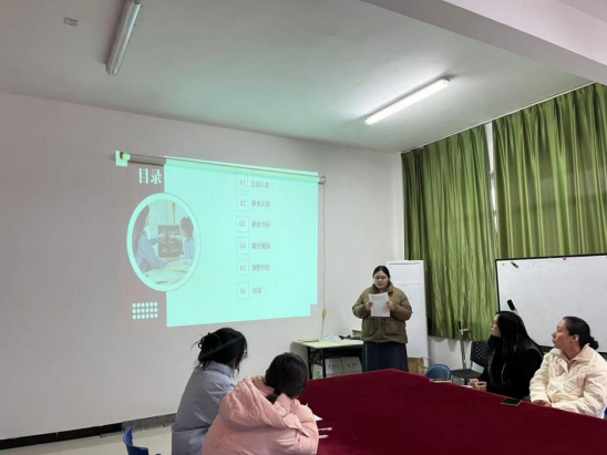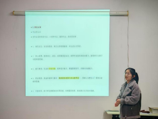 同样,立志于三尺讲台,24级英语专业的吴紫玲同学则展现了一条不同的路径。她的职业目标是成为一名深受学生喜爱的中小学英语名师及班主任。她的展示充满了对青少年心理的洞察与关怀,提出要成为一名“不仅懂英语,更懂学生”的教育者。她分享了在校期间担任班级学习委员一职,特别强调,她希望通过创设“戏剧教学法”等趣味课堂,打破学生对英语的畏难情绪。