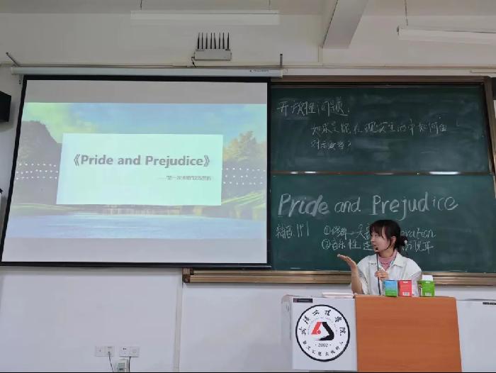 谢祥慧同样为同学们讲述了英国小说《傲慢与偏见》,该小说揭示了当时英国社会中复杂的婚姻观念、阶级差异和角色性。主讲人使用英语向同学们介绍了小说中的主旨及意义,利用英文提问的方式巩固同学们对该故事的学习,将文学的独特魅力带入到课堂中。