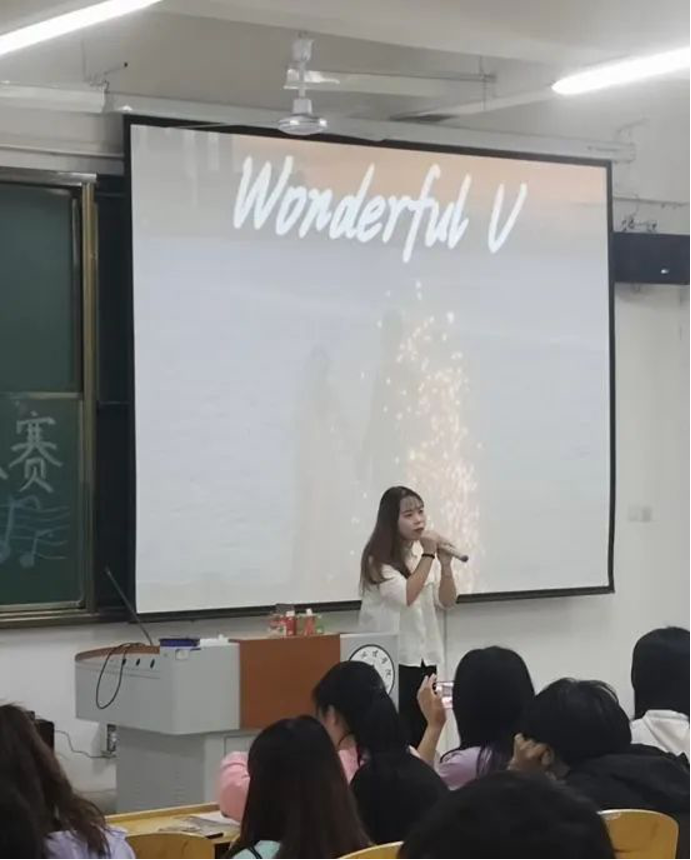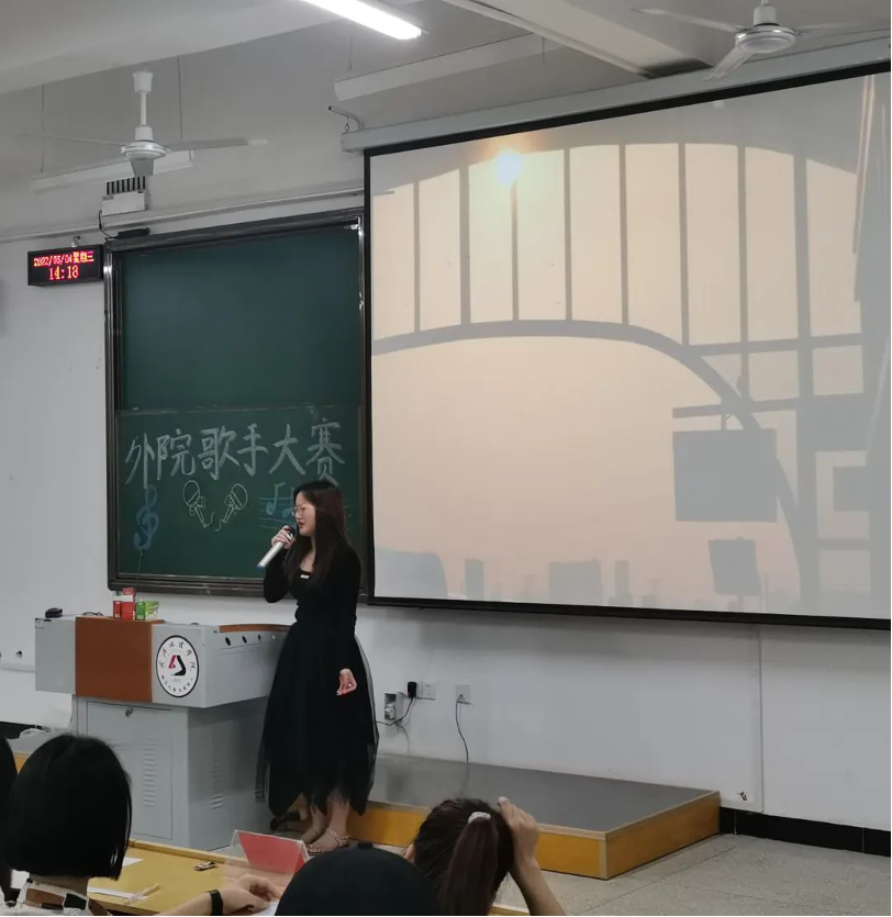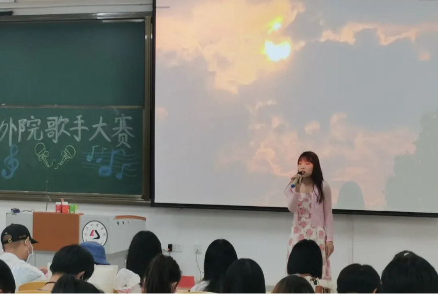 21级法语班罗欣怡的一首《Wonderful U》更是将观众们带回那个深切的回忆之中,歌声婉转动人。将女生在爱情中爱而不得的遗憾展现的淋漓尽致,赢得观众们的阵阵掌声。